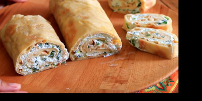 Od te mase ispeći 1 palačinku kao kajganu. Ostaviti da se malo prohlade, za to vreme pomešati kiselu pavlaku i krem sir. Uzeti tepciju i prvo staviti palačinku, premazati filom pa posuti sušenim povrćem, preko staviti palačinku od jaja, preko nje ponovo fil, preko fila ponovo palačinku i premazati ostatkom fila. Ostaviti jednu kašiku fila za premazivanje odozgo. Uviti rolat od palačinki. Umotati u foliju i ostaviti da se ohladi. Ohladjen rolat premazati filom i posuti sa malo sušenog povrća.