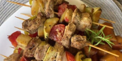 U iseckane i posoljene šnicle dodati kašiku maslinovog ulja i tri kašike senfa i malo majorana. Sve sastojke sjediniti. Svo povrće iseckati na malo krupnije kockice. Redjati po želji na štapiće. Pržiti na umerenoj temperaturi sa vrlo malo ulja. Prijatno!