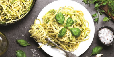 Napravite sos tako što ćete u blenderu pomešati sve sastojke. Tikvice isecite na vrlo duge i tanke trake da izgledaju kao špagete. Pomešajte ih sa solju i ostavite da se ocede oko pola sata. Probajte rukama da iscedite preostalu vodu, ali nežno, da ih ne zgnječite. U dubljem tiganju na jakoj vatri propržite četvrtinu tikvica (ne celu količinu, neće biti hrskave), oko tri minuta uz mešanje. Ponovite isto sa preostalim tikvicama. Poslužite ih sa pestom, a možete da ih pospete prepečenim orasima, parmezanom ili dodate krišku limuna.