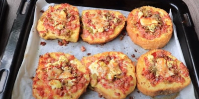 Sir izdrobiti dodati jaje i mleko i umutiti žicom dodati i malo maslinovog ulja i sve izjednačiti. Šunku i maslinke usitniti na kockice. Svaku krišku hleba umočiti u sir i mleko i ređati u podmazan pleh. Odozgo staviti malo kečapa, seckane šunke i maslinki i po listić kačkavalja. Posuti origanom i opet malo kečapa. Peči na 200 stepeni C oko 15-20 min.