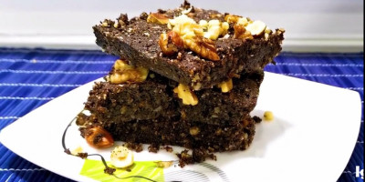 Istopite na pari puter i čokoladu, dodajte koricu limuna i ekstrakt vanile. Umutite u posebnoj posudi jaja, pa dodajte kakao i zaslađivač po želji. Sipajte istopljenu čokoladu u posudu sa jajima i dodajte bademovo brašno. Stavite smesu u nauljen pleh, preko toga dodajte izmrvljenje lešnike ili orahe. Pecite 15 minuta na 180°C.