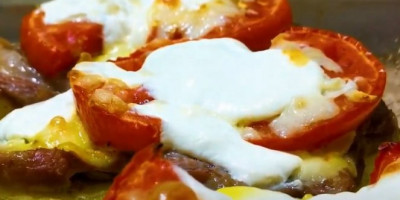 U podmazan pleh, stavite kolutove luka debljine 1 cm, pa dodajte šnicle. Posolite i pobiberite, dodajte senf preko mesa i kolutove paradajza. Pospite sve seckanim belim lukom, dodajte rendani kačkavalj i grčki jogurt. Pecite 45 minuta na 180 stepeni Celzijusa.