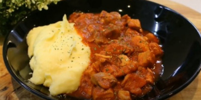 Belo meso isecite na željene komade, obično na kocke srednje veličine. Ostalo povrće očistite pa iseckajte takodje na kockice, ili kolutove. Na malo maslinovog najpre prodinstajte luk, zatim dodajte ostalo povrće i meso. Dodajte 2 kašike vode, pa dinstajte uz povremeno mešanje, da se sve ravnomerno uprži.