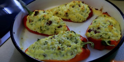 U činiji izmešajte sredinu hleba, sir, jaja, mleko, iseckan peršun, malo soli i iseckane kobasice. Paprike isecite po dužini, malo ih posolite i punite. Poprskajte uljem i pecite na 200°C oko 35 minuta.