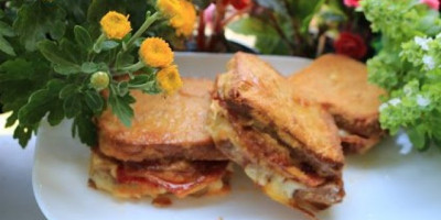 Na jedno parče hleha staviti kačkavalj, pa listove pečene paprike, suvi vrat ili šunku i 2 parčeta kulena