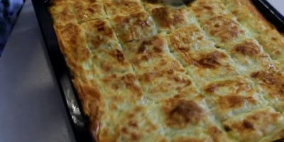 Ređati opet tri kore pa meso, sve dok ne završite. Iseći oštrim nožem pitu pa je preliti zalivom koji smo prethodno umutili.