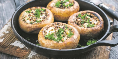 Isecite sitno luk, pomešajte sa sirom, kiselom pavlakom i seckanim biljem, dozirajte začine i papriku po ukusu. Izdubite šampinjone i napunite ih ovom smesom. Zapecite u rerni 10-15 minuta. Feta-sir se neće topiti i neće izaći napolje. Servirajte toplo, ukrasite seckanim listovima peršuna.