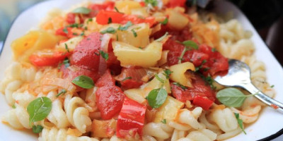 Pržiti da ispari tečnost ostaviti malo ne sasvim. Makarone skuvati i ocediti i malo pouljiti.