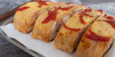 Pecite u rerni zagrejanoj na 180 stepeni oko 15-20 minuta ili dok lepo ne porumeni. Izvadite rolat iz rerne, pospiterendanim trapistom, prošarajte kečapom i vratite u rernu par minuta dok se sir ne rastopi.