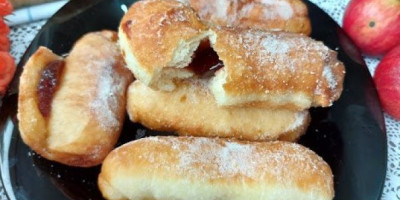 Deo odvojenog testa razviti oklagijom 1/2 cm debljine iseći na pravougaonike i puniti sa džemom.