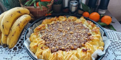 Pogaču staviti u tepsiju sa pek papirom Sredinu napuniti kremom u koji ste ubacili krupno seckan kikiriki. Ostaviti da malo naraste pokrivena pa premazati žumancetom pa naraslu pogaču pitu peći na 180 stepeni C oko 40 min. Pokriti 10 min da se odmori.