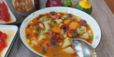 Iseckati luk, papriku,šargarepu,celer, ako imate karfiol cvetove i sve dobro predinstati na ulju da omekne. Dodati crvenu papriku, biber secena kockice krompir, celer kuvan pasulj i kukuruz.