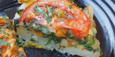 Odozgo idu kolutovi paradajza.. Posoliti paradajz i premazati uljem. Peći u rerni na 220 stepeni C oko 30 min da se malo zapeće. Odličan obrok bez hleba veoma zdrav.