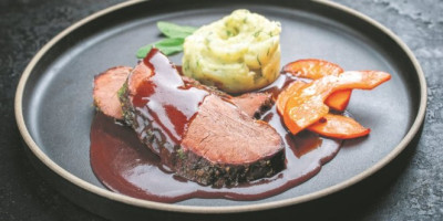 Stavite meso u posudu za pečenje, oko mesa stavite krupno naseckani crveni luk, paradajz i suve šljive i zalijte vinom. Sve pokrijte folijom i pecite na 185 stepeni oko 90 minuta. Proverite da li je meso pečeno, a ako nije, produžite s pečenjem dok ne omekša. Kad je meso gotovo, sos koji je ostao od pečenja propasirajte. U propasirani sos dodajte kruške nasečene na kriške i sve skupa kuvajte pet minuta. Meso nasecite na šnicle i prelijte gotovim sosom. Služite uz povrće po izboru.