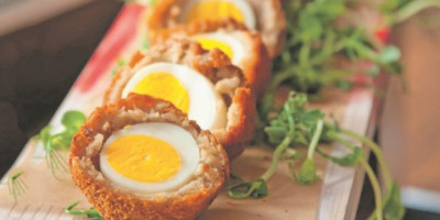 Pomešajte mleveno meso sa peršunom, žalfijom, kašikom senfa, korom od pomorandže, solju i ostalim začinima po ukusu. Oko svakog oljuštenog, kuvanog jaja umotajte smesu od mlevenog mesa i gledajte da sloj (oko 5-7 mm) bude jednak. Uvaljajte jedno po jedno jaje u brašno, a zatim u jaja i prezle i pržite u dubokom ulju.