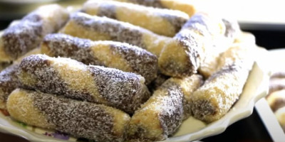 Ostavite da se smese ohlade(ne da se stegnu), razvucite na pek papiru beli deo uz pomoć oklagije, na drugom pek papiru razvucite tamni deo i potom preklopite testa jedno preko drugog. Pređite oklagijom da se delovi spoje. Secite trake širine oko 1 cm. urolajte i uvrnite da se naprave šare (možete pogledati u videu). Secite manje komade i uvaljajte u kokos. Ostavite kolače u frižideru da se stegnu. Prijatno!