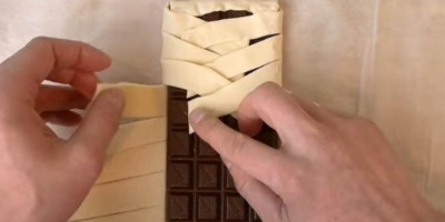 Rernu zagrejte na 190 stepeni, na pleh stavite papir za pečenje. Razvaljajte lisnato testo, premažite ga umućenim jajetom i na njegov centar stavite tablu čokolade.