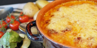Oljuštite krompir, isecite ga i kuvajte oko 15 minuta. Procedite ga, začinite i prelijte maslinovim uljem. Umutite dva jaja i pomešajte sa feta sirom i randanom gaudom, pa sve pomešajte sa krompirom. Prespite sve u nauljenu vatrostalnu činiju ili pleh, pa prelijte sa dva umućena jaja kojima ste dodali malo mleka. Pospite parmezanom i pecite oko 20 minuta na 200 stepeni.