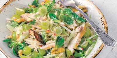 Piletinu isecite na trakice posolite, pobiberite i blago začinite, pa propržite na malo ulja, tek da počne da rumeni. Dok se meso prži pripremiti preliv: umutite majonez i pavlaku, dodajte sok limuna, soli i bibera po ukusu. Celer i jabuke oljuštite i iseckajte na žilijen rezance, dodajte prohlađenu piletinu, zrna grožđa i seckane orahe i sve začinite prelivom. Lagano promešajte, pa sipajte u činiju obloženu listovima zelene salate.