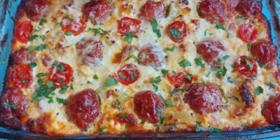 Preliti sa spremljenim prelivom. Izmedju služiti sitne male ćuftice. Ćuftice malo preliti uljem. Peći na 200 stepeni C oko 60 min.