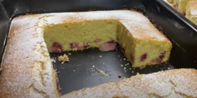 Umutite belanca sa šećerom i vanilin šećerom. Zatim dodajte žumanca, jogurt, mleko i ulje. Posle svakog dodavanja mutite. Na kraju dodajte suve sastojke, brašno, griz i prašak za pecivo. Opet umutite, pa dodajte iseckane jagode. Sipajte smesu u nauljenu tepsiju i pecite na 200°C 30-35 minuta. Pospite šećerom u prahu.