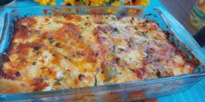 Preko testenine sipati spremljen nadev pa protresti da dodje izmedju testenine. Odozgo dodati malo još mrvljenog sira i rendanog kačkavalja, Peći u rerni na 220 stepeni oko 30 min. Vrhunsko..