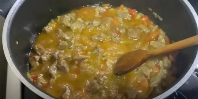 Propržiti junetinu na ulju par minuta da dobije koricu, zatim izvaditi iz šerpe. U isto ulje staviti sitno iseckano povrće i propržiti. Vratiti junetinu u šerpu. Promešati, začiniti i naliti sa malo temeljca. Nastaviti kuvanje. Nakon dvadesetak minuta dodati još temeljca. Kuvati dok meso ne bude bas mekano, po potebi dodavati temeljac. Za kraj smanjiti temperatru i dodati dve kafene kašičice začinske paprike, vrlo malo suvog začina i soli i jednu do dve kašičice brašna. Promešati, dodati iseckan krompir, i jedan paradajz. Naliti i ostaviti da se krčka još 20-25 minuta. Dodati sveži peršun. Prijatno!