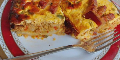Skinuti sa vatre dodati soli biber papriku i 1 jaje. Umutiti posebno jaja dodati pavlaku i mleko pa izjednačiti. Krompir očistiti pa iseći na tanke krugove posoliti pobiberti i dodati malo crvene paprike. .