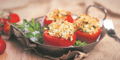 Integralni pirinač prvo ostavite da nabuburi, a zatim ga obarite. Mladi luk iseckajte na sitne kolutiće, sardine izgnječite. Izmešajte sve, blago promešajte, posolite, pobiberite i dodajte seckani svež peršun. Paradajz isecite oko peteljke, izdubite kašičicom i ostavite da se ocedi. Napunite filom i poslužite, a možete ga prethodno i zapeći u rerni.