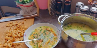 Dodati biber začin list peršuna po želji beli luk u granulama. Sipati u tanjir i dodati kockice hleba (kubeti...krutoni).