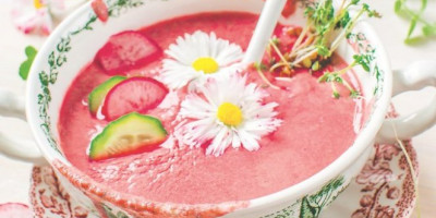Sastojci: 2 male cvekle zajedno sa listovima, 3 kašike limunovog soka, šolja plus dve trećine šolje vode ili bujona od povrća, 750 ml grčkog jogurta (može i/ili kefir), 3-4 kašičice mirođije sitno iseckane, 4 kašičice vlašca sitno iseckanog, 10 rotkvica grubo narendanih, krastavac dužine 15 cm, oljušten, grubo narendan, čen belog luka zgnječen, morska so i biber po ukusu.