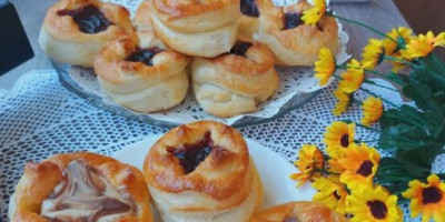 Od navedenih sastojaka za testo formirati mekše testo i ostaviti da odmori 30 minuta. Razviti na pola centimetara debljine i vaditi kalupom krofne. Spajati po dve i makazama iseći sredinu kao što je prikazano u videu (pogledajte dole) i u sredini staviti kašičicu džema ili čokoladnog krema. Malo neka odmore pa ih premazati žumancetom i peći na 190 stepeni oko 30-35 minuta.