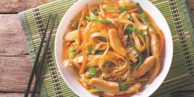 Pomešajte gustin i soja sos, a zatim dodajte preostale sastojke za sos. Premažite piletinu sa kašikom sosa i ostavite je na 10 minuta. Rezance pripremite prema uputstvu. U voku ili velikom tiganju na jakoj vatri propržite beli luk, dodajte piletinu i mešajte dok ne porumeni, oko minut. Dodajte kupus, šargarepu i iseckani beli deo crnog luka, pržite mešajući 1-2 minuta dok kupus ne svene. Dodajte rezance, sos i vodu. Pržite mešajući još minut, pa dodajte klice pasulja i perca luka. Mešajte još 30 sekundi dok pasulj ne počne da vene, skinite sa vatre i poslužite.