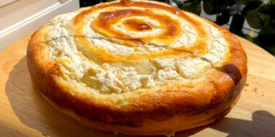 Pecite u zgrejanoj rerni na 200 C oko 35 minuta. Kada pogača porumeni sa gornje stran stavite foliju, da ne izgor. Pogača je sa gornje strane mekana. Kada sa donje strane porumeni pogača je pečena. Ostavite da se prohladi pa je isecite i poslužite.