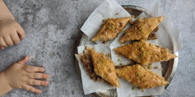 Na kraju, baklavu pokrijte sa tri kore i to tako što svaku, nakon stavljanja, premažete puterom, osim poslednje. Pre sečenja, pritisnite baklavu dlanovima i izravnajte sve. Baklavu potom secite u oblik dijamanta. Stavite u rernu, prvo desetak minuta na 190 stepeni, dok ne dobije svetlosmeđu boju, a onda 45 minuta sušite na 150 stepeni. Ako vam se učini da će biti previše tamna, pokrite je aluminijskom folijom i nastavite da pečete. Proverite da li je pečena tako što ćete viljuškom razmaći baklave i pogledati da li je i dno pečeno. Vruću baklavu zalijete hladnim prelivom i pritisnite tepsijom ili plehom na 10 minuta da bi se kore izravnale.