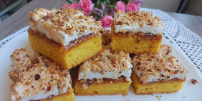 Izvaditi i premazati sa džemom i posuti sa 50 gr seckanih oraha i lešnika. Belabca umutiti sa šećerom dodati 2 kašike limunovog soka. Mutiti 5-6 min. da se dobije cvrst šne,