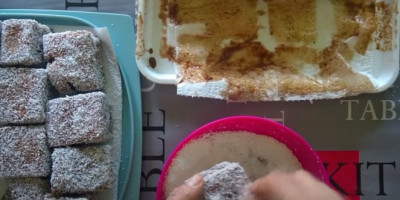 Svaku kockicu umakati u preliv koji je ostao. Ako vam je preliv pregust dodati 3 kašike vrele vode. Posle umakanja kockica u preliv uvaljajte u kokos pa slažite na tacnu. Punjeni čupavci se mogu poslužiti odmah!