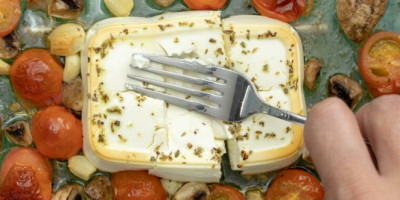 Stavite paradajz, pečurke i beli luk u pleh. Prelijte maslinovim uljem. Posolite, dodajte bosiljak sušeni i promešajte. Stavite po sredini fetu i prelijte maslinovim uljem i bosiljkom. Stavite u rernu na 200 c -25-30 minuta.