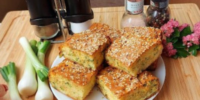 Dodati jogurt, mleko, seckan luk, peršunov list i malo soli. Dobro promešati i sipati u podmazan pleh izjednačiti posuti susamom i peči na 200 stepeni C oko 50-60 min da se dobro ispeče. Služiti toplu.