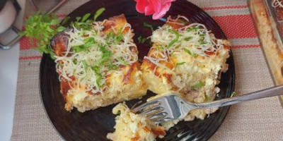 Luk iseckati, pa ga propržiti na ulju, dodati mleveno meso i dinstati 15 minuta. Dodati soli, bibera. Testeninu obariti pa iscediti. Dodati mleveno meso. U činiji umutiti jaja, dodati sir, mleko, pavlaku i kačkavalj. Pleh podmazati uljem, pa sipati testeninu sa mesom. Odozgo sipati jaja i protresti terpsiju da pavlaka padne između testenine. Odozgo možete dodati još malo rendanog kačkavalja. Peći oko 45 minuta da ispari tečnost i lepo se zapeče. Uživajte u fantastičnom ukusu...