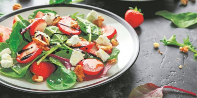 Zatim u posudi za salatu pomešajte opran spanać (možete i kratko da propržite ako ne volite sirov), pa dodajte jagode isečene na četvrtine, izmrvljeni sir i luk iseckan na kolutove ili polumesec. Na kraju dodajte i propržene orahe, pa sipajte preliv i lagano promešajte dok se ne sjedini.