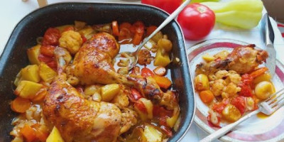 Ubaciti karfiol i pradajz na kocke. Možete dodati i glavičice mladog luka crnog i belo. Posolitoi i pobiberiti. Meso posoliti pa utrljati gotov začin za piletinu premazati uljem i ušuškati ga u povrće.