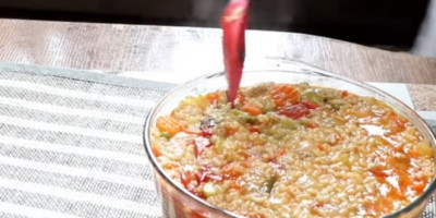 Polovinu mešavine stavite u vatrostalnu posudu, preko nje složite belo meso isečeno na komade i prethodno kratko preprženo na tiganju, a zatim stavite preostalu mešavinu. Sve prelijte uljem i toplom vodom i pecite oko 15 minuta na 200 stepeni.