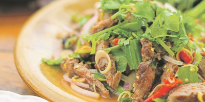 Govedinu isecite na šnicle i ispecite u gril tiganju. Za preliv sitno iseckajte beli luk i čili, dodajte so, sok od limete i šećer. U činiji promešajte govedinu, luk i krastavac, prelijte prelivom i dodajte listove zelene salate. Ukrasite svežim listovima korijandera i percima luka, a po želji možete da dodate i kozji sir i sve servirate uz mlade krompiriće.