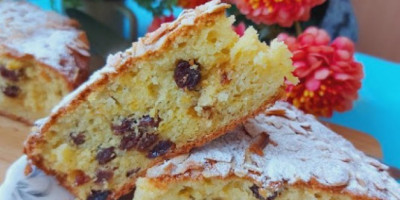 Umutite jaja sa šećerom. Pomešajte brašno i griz i prosejte u umućena jaja. Dodajte ulje, suvo grožđe, koricu limuna i jogurt. Sve polako izmešajte. Pleh prečnika 22 cm podmažite i pospite brašnom, sipajte smesu i izravnajte. Pecite na 200 stepeni oko 40-45 minuta, sačekajte da se potpuno ohladi, isecite i poslužite.
