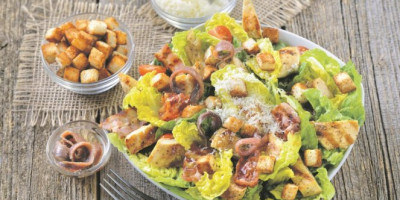 Slaninu propržite bez dodavanja masnoće. Hleb isecite na kocke i u rerni ispecite da bude kao tost. Na teflonu ispecite piletinu i kad se prohladi, isecite na dugačke trake. Pomešajte sa iseckanim belim lukom i propržite na masnoći koju je pustila slanina. Pomešajte maslinovo ulje sa sokom od limuna, posolite i pobiberite. Dresingom prelijte salatu, preko poređajte piletinu, slaninu, krutone (prepečeni hleb), čeri paradajz, krupno narendani parmezan i preko toga prelijte umućenu pavlaku s majonezom. Napomena: salatu po želji možete da obogatite filetima inćuna.