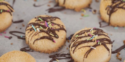 Umutite belanca, pa dodajte šećer i sjedinite žicom. Zatim dodajte so i vanilu, pa promešajte. Na kraju ide kokosovo brašno. Možete dodati brašno po vašoj želji, ako ne volite kokosovo. Lepo sjedinite i ostavite u frižideru bar 10 minuta. Dok je testo u frižideru zagrejte rernu na 160°C. Uz pomoć kašike za sladoled uzimajte smesu i ređajte ne pleh obložen pek papirom. Ubacite ih u rernu na 160°C nekih 15-20 minuta, a nakon nekih 8 minuta okrenite pleh da se zapeče i druga strana jednako. Kada se ispeku, ostavite ih još 10 minuta, a zatim ih umočite u istopljenu čokoladu. Ostatkom čokolade poprskajte kolače po vrhu, a onda pospite šarene mrvice preko.
