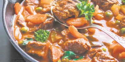 Iseckajte meso na sitnije kocke i pržite na zagrejanom ulju. Kada tečnost iz mesa ispari, dodajte šolju vode i kašičicu soli, pa kuvajte oko 20 minuta, odnosno dok ne ispari sva voda. Potom stavite sitno seckani crni luk i pržite desetak minuta. Nakon toga dodajte iseckani paradajz, so, biber, suvi začin, beli luk i mlevenu papriku, pa kuvajte još oko pet minuta. Dodajte krompir, grašak i dve šolje vode. Kada proključa, smanjite temperaturu na srednju i kuvajte 30-35 minuta.