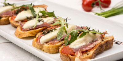 Za to vreme posebno ispržite jaja na oko i slaninu isečenu na šnite. Izvadite hleb i na svaki komad stavite po jedno jaje na oko, parče slanine, pa posolite i pobiberite i poprskajte maslinovim uljem. Služite toplo.