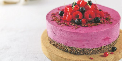 Čokoladu rastopite s puterom. Keks, ako nije mleven, stavite u kesicu i razmrvite oklagijom, pa pomešajte s čokoladom. Okrugli kalup obložite papirom za pečenje, stavite smesu, poravnajte i stavite u frižider. Pola voća (ili manje) ostavite za ukrašavanje, ostalo izmiksajte, propasirajte i pomešajte s vanilin-šećerom. Umutite šlag od pavlake, dodajte kiselu pavlaku, šećer, sok i koru od limuna, kao i pire od voća. Rastopite želatin, pa dodajte u fil. Gotovim filom premažite koru od keksa, poravnajte i stavite na četiri sata u frižider. Pre posluživanja ukrasite preostalim voćkicama.